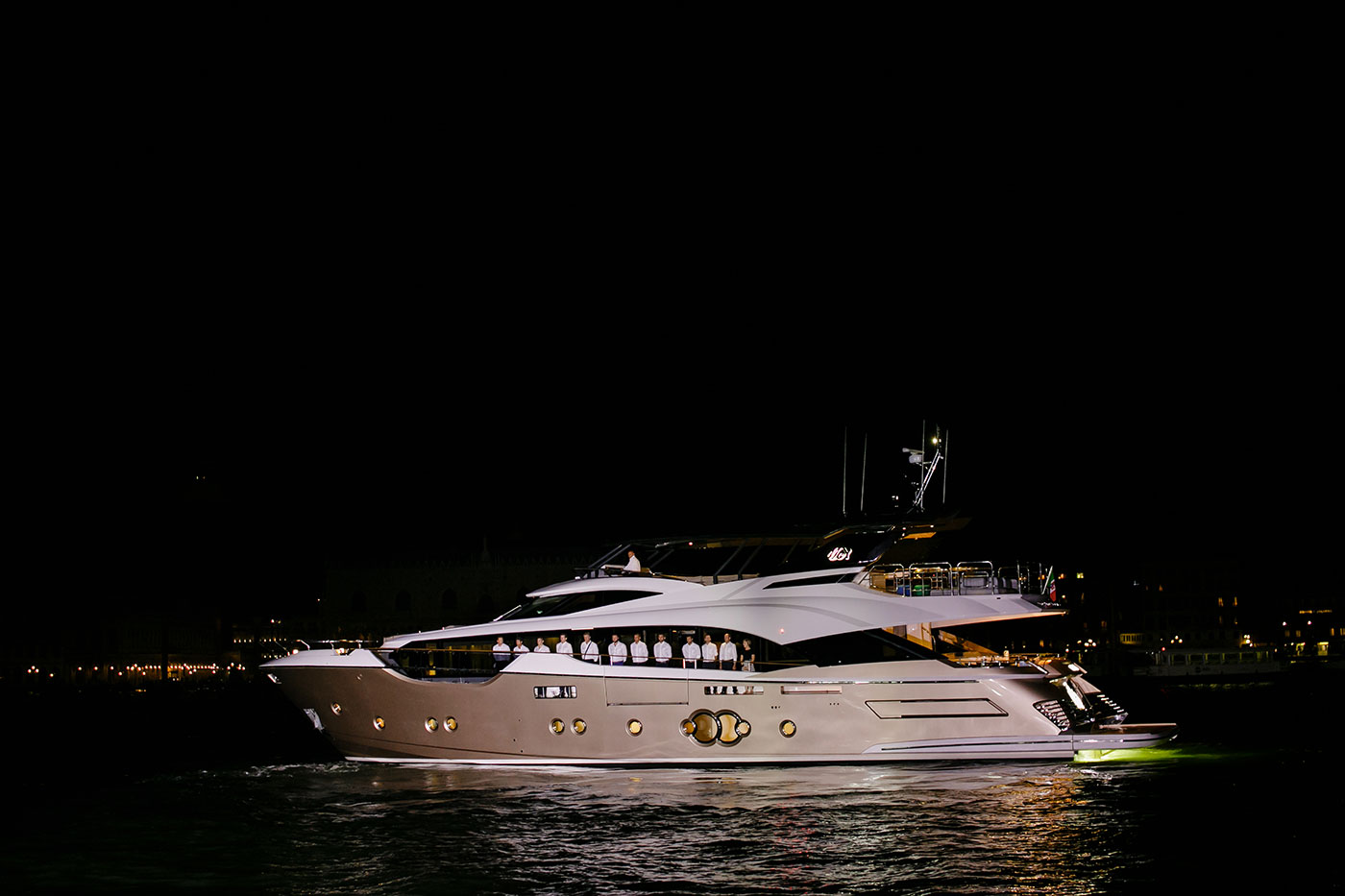 The performance’s final act, the last image projected on the screen, announced the arrival of the MCY 96, which shortly after appeared upon the Canal Grande, the highlight of a magical evening rich in surprises and Venetian allure.