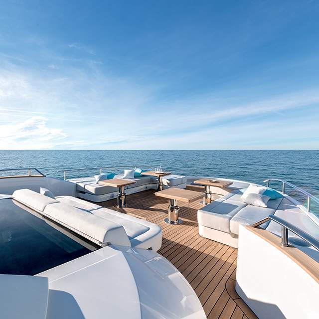 The enclosed flybridge spans 43 square meters and is home to an upper deck lounge and a dining area with 360-degree views and glass ceilings. The elegant internal spaces are complemented by equally charming outside areas: from the bow lounge with sun pads and dining tables to the best-in-class, remarkably spacious aft cockpit, countless hours of fun and relaxation await on board. With unlimited options in terms of intended uses, distribution of space and customisation, MCY 105 Skylounge guarantees unprecedented levels of freedom.